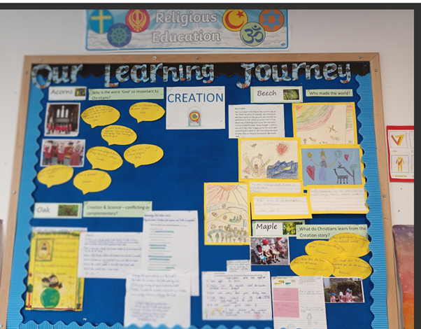 We use individual work books to record our work, except in EYFS, where a shared floor book shows the range of learning activities that have taken place in RE with our younger children. Religious Education is taught once a week and we use Journey Days to focus on a particular area of learning, where the whole school family comes together to share in this learning experience through different activities.